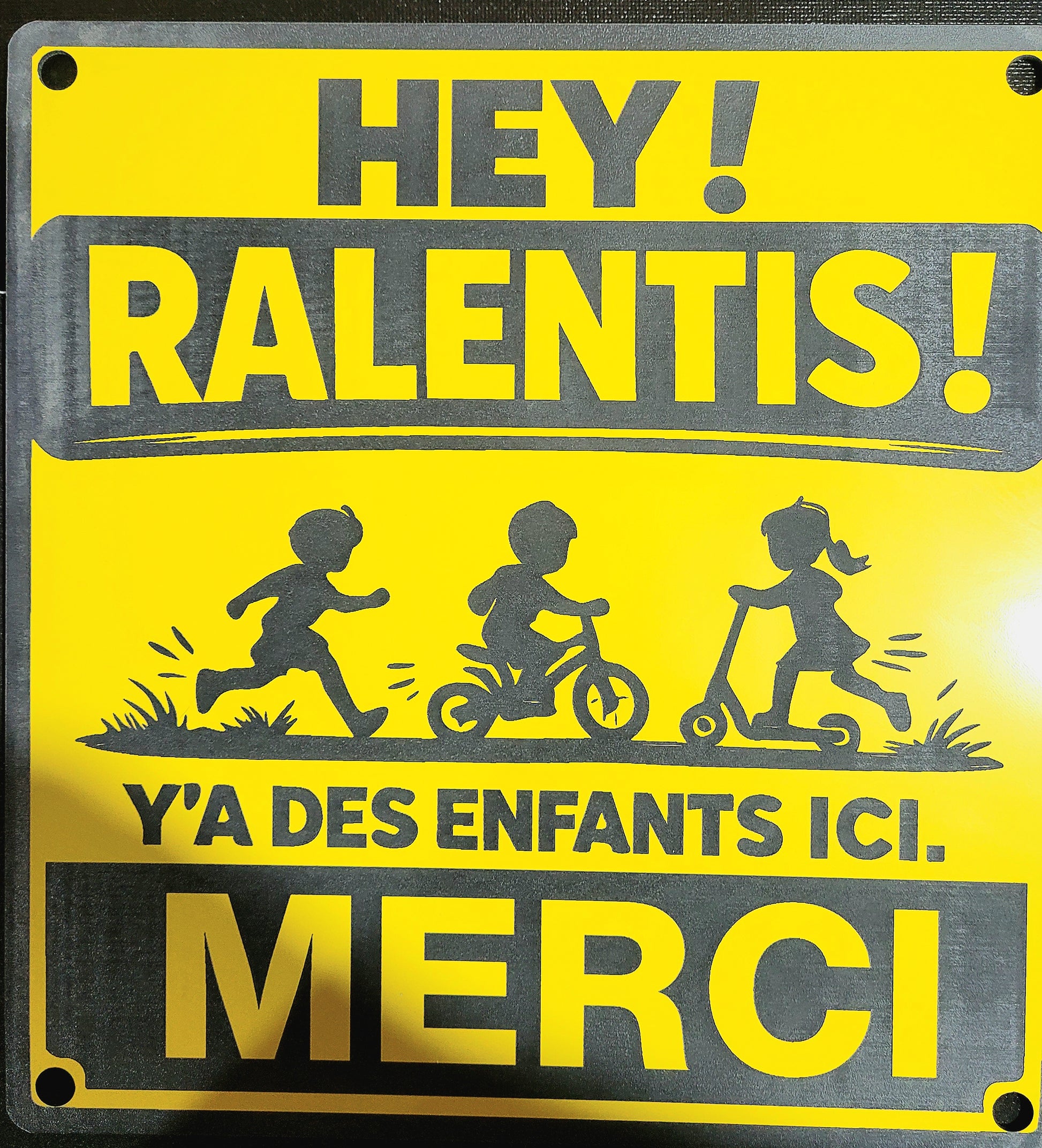 HEY ! RALENTIS ! – Y’a des enfants ici. Merci. | Panneau 10 x 10 pouces